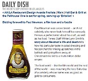 I’m relieved to see Kim Severson’s article, And Then There Was the Food, addressing Newman’s Own’s contributions to the food world in The New York Times food section today. The Los Angeles Times food section disappointed as far as Paul Newman or Newman’s Own. At least Newman made their Daily Dish blog.